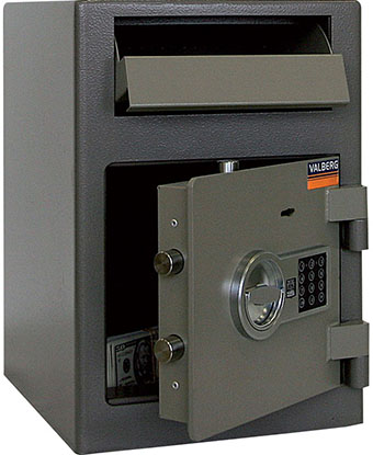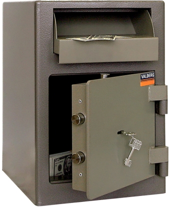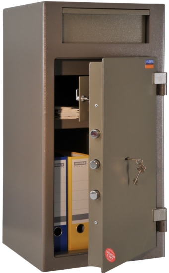 Депозитные сейфы: Для хранения наличных денег в магазинах, пунктах обмена, кафе и ресторанах, торговых точках, автозаправках, везде, где необходимо ограничить доступ к наличности, как от злоумышленников, так и от обслуживающего персонала. Выручка или документы закладываются в сейф через лоток, а открыть сейф и извлечь содержимое может только администратор (инкассатор). Конструкция сейфа не позволяет изъять содержимое через лоток (установлено антифишинговое устройство), а дверь защищена надежным замком, таким образом, депозитный сейф практически исключает хищения. Также предусмотрена возможность крепления к полу анкерным болтом. Это исключает хищения ценностей вместе с сейфом.